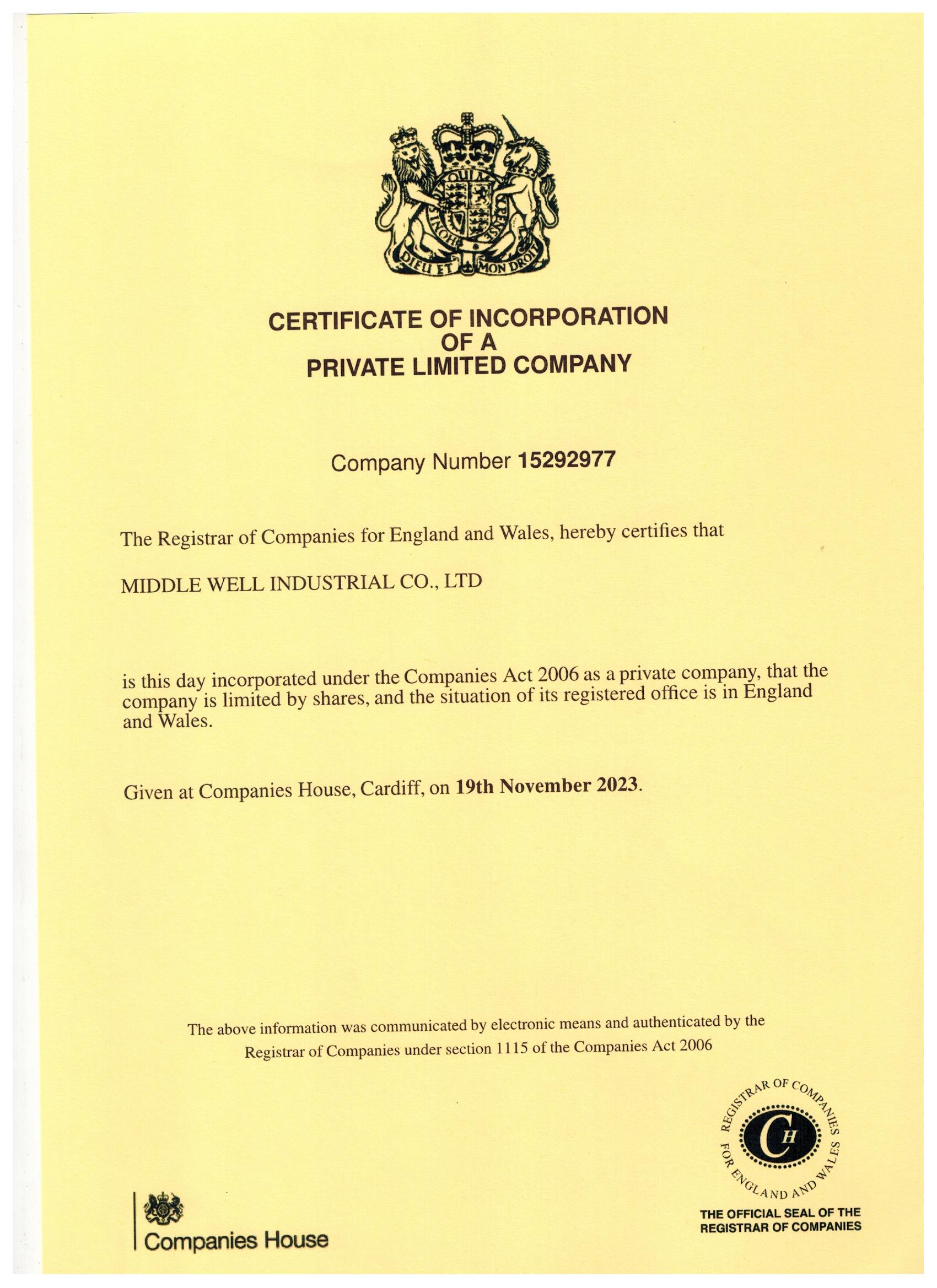 热烈祝贺本公司江苏菲期特流体科技有限公司拿到了MIDDLE WELL INDUSTRIAL CO.,LTD 这个公司在大陆地区代理业务
