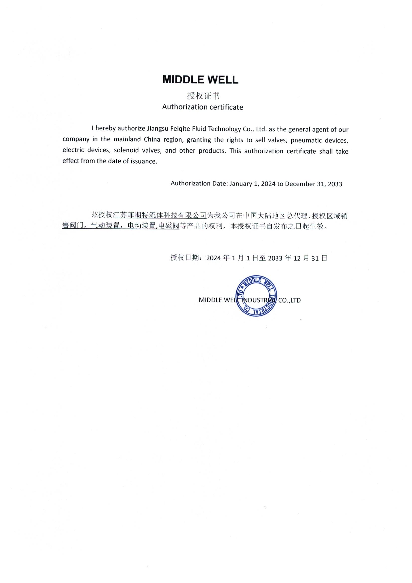 热烈祝贺本公司江苏菲期特流体科技有限公司拿到了MIDDLE WELL INDUSTRIAL CO.,LTD 这个公司在大陆地区代理业务!
